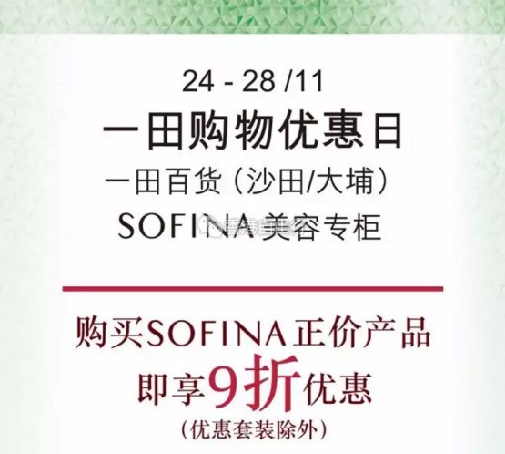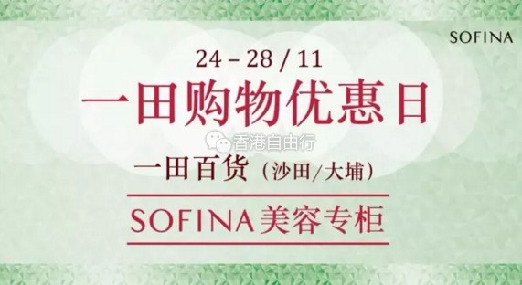 11月的精彩优惠一浪接一浪,MM们入手了哪款心水护肤美妆套装?半年一度的【一田购物优惠日】载誉登场!由11月24日至28日一连5天,一田百货沙田及大埔店SOFINA美容专柜将推出一系列超值特选优惠,当中包括低于半价的ALBLANC润白美肌防晒护肤套装,关注度爆表!还有11月25日及27日推出的一天限定套装,热抢之选,万勿错过!