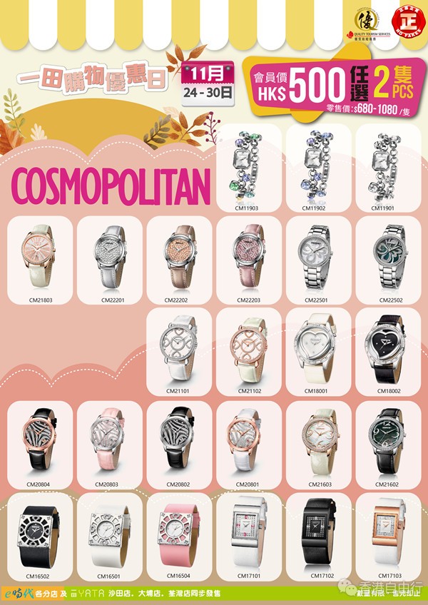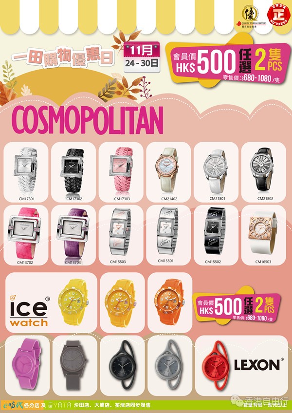 一田购物优惠日又来萝!e时代准备了大量款式型号手表,为大家提供超值优惠折扣。为求大家买得高兴,除了於一田大埔、沙田、荃湾发售,e时代全线分店均同步发售。本店为「优质旅游服务」计划认可零售商户,并取得香港零售管理协会保证所售产品全为正版正货。来e时代扫平货同时不怕买到假货。