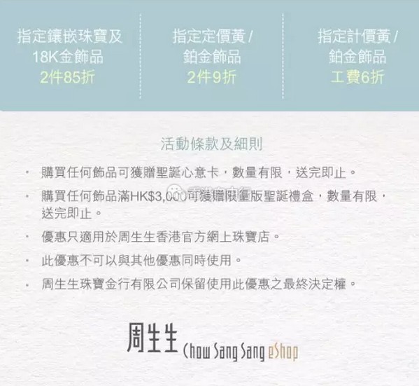 购买任何饰品可获赠圣诞心意卡,另购买任何饰品满HK$3000可获赠限量牌圣诞礼盒。数量有限,送完即止。