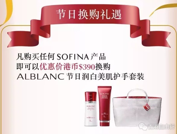 正式踏入12月,MM们已开始筹划圣诞庆祝大计吧?别忘了为自己为身边知己好友送上贴心的圣诞礼物!而苏菲儿已为大家准备好多款圣诞礼遇,由即日至12月31日,凡于SOFINA专柜及专门店购物,即可以优惠价港币$390入手ALBLANC节日润白美肌护手套装!亦可以折扣价港币$290换购Primavista柔亮持久防晒粉饼连秋冬限定粉盒,为美好的圣诞佳节做好准备!