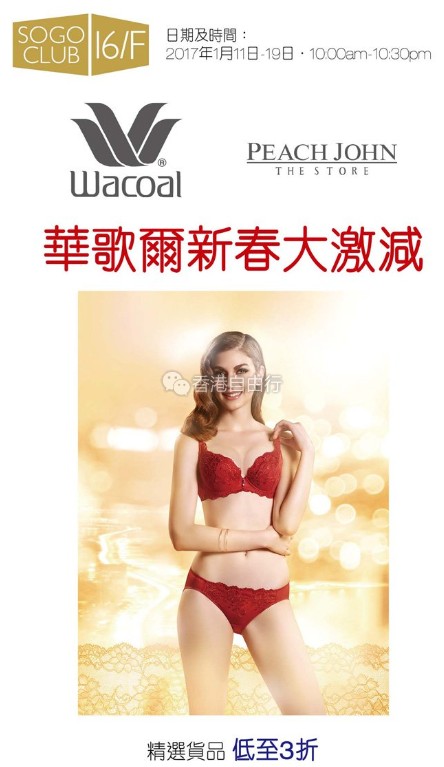 SOGO铜锣湾店本周有华歌尔新春大激减低至3折,还有新春床品及家品展低至6折,尖沙咀店则有行李箱包优惠,还有贺年美食优惠等。