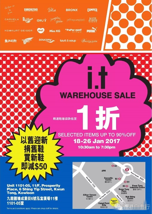 i.t现正于观塘泓富广场举行新春鞋履开仓,反应热烈,现场已增添多款精选鞋履及手袋货品低至1折起,当中参与品牌包括New Balance、Puma、Teva、Red Wing、Vans、Converse、Dr. Martens、Superga、Jeffrey Campbell、emu、mel、CAMPER、KURT GEIGER、as know as de Rue、KATIE JUDITH、PaPer minT、puzzle、tout à coup、Venilla suite等。