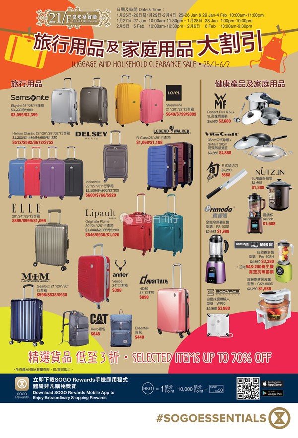 香港打折:SOGO崇光百货21F/旅行用品及家庭用品大割引(至17年2月6日)