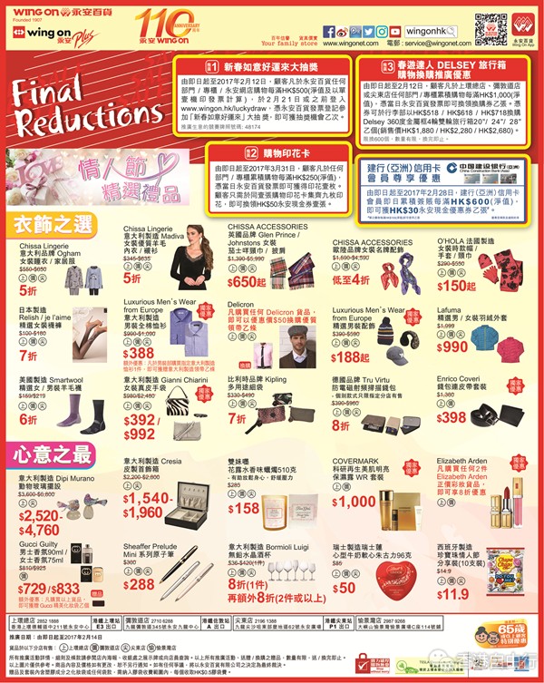 香港打折:永安百货情人节精选礼品特价优惠低至4折(至17年2月14日)