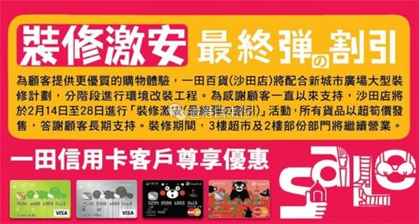 为顾客提供更优质的购物体验,一田百货(沙田)将配合新城市广场大型装修计划,分阶段进行环境改装工程。为感谢顾客一直以来支持,沙田店将于2月14日至28日进行<店铺改装终极割引Sale>活动,所有货品以超笋价发售,答谢顾客长期支持。