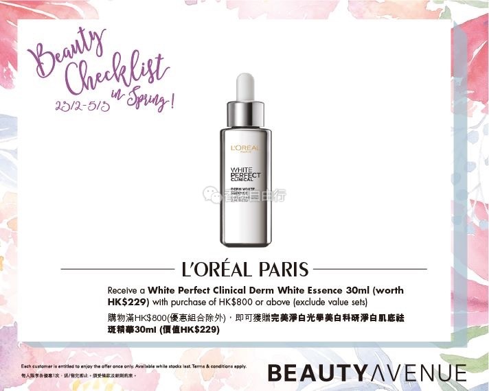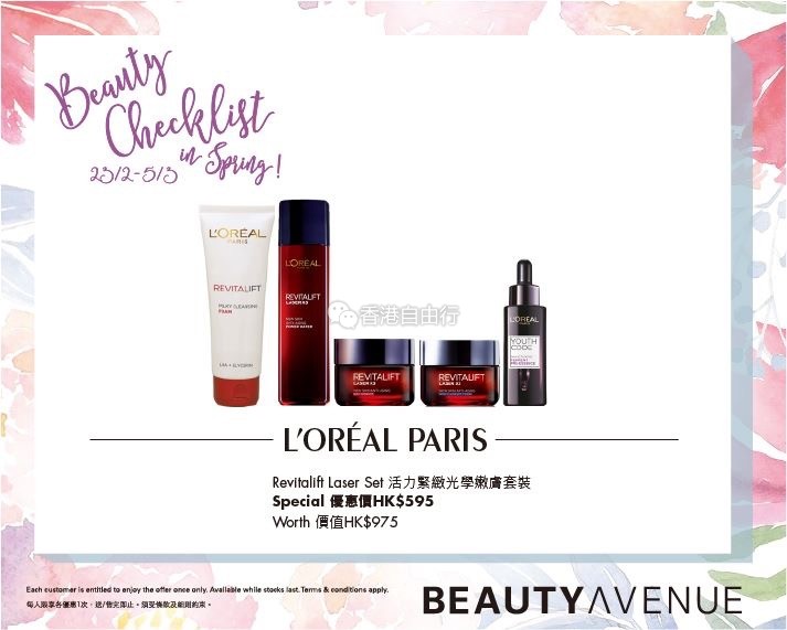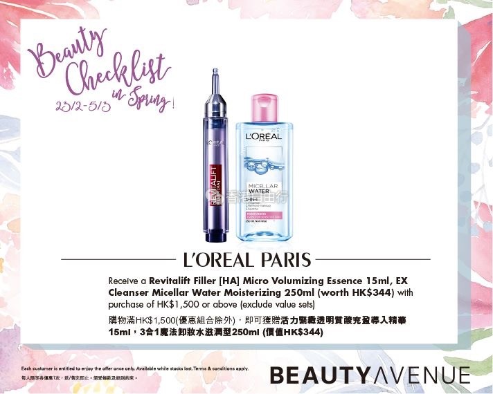 *优惠只适用于L’OréalParis朗豪坊BEAUTY AVENUE专柜。所有产品/礼品先到先得,售/送完即止。