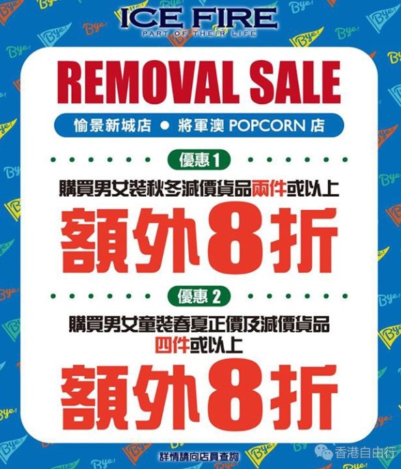 ICE FIRE愉景新城及将军澳POPCORN店租约快将期满,现正举行REMOVAL SALE,推出两大优惠让大家于转季期间以优惠价入手春夏货品!