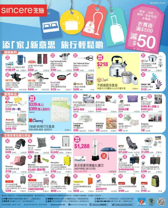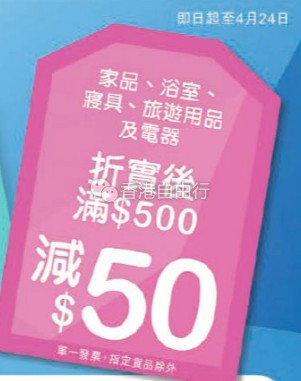家品、浴室、寝具、旅游用品及电器折实后满500港币即减50港币