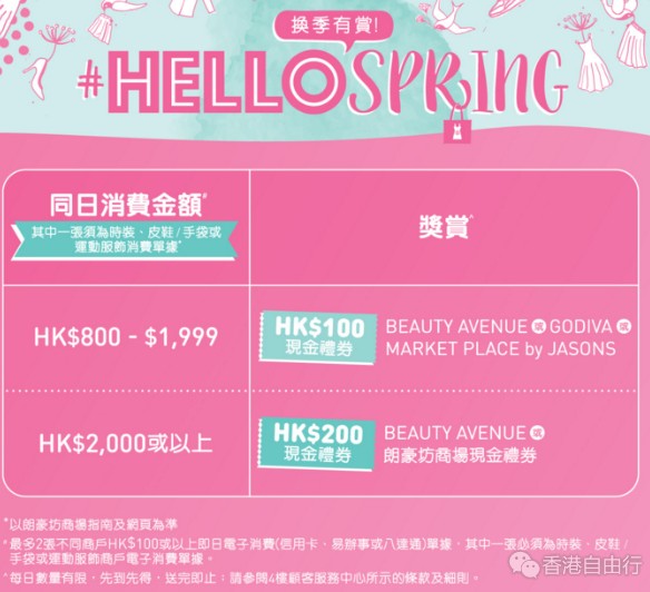 霸气承包你的换季衣橱!即日起6月7日前,于朗豪坊同日电子消费满HK$800 - $1,999(最多2张不同商户),可换领HK$100现金礼券;同日电子消费满HK$2, 000或以上(最多2张不同商户),可换领HK$200现金礼券!只要其中一张消费单据为时装、皮鞋/手袋,或运动服饰,就可以啦!