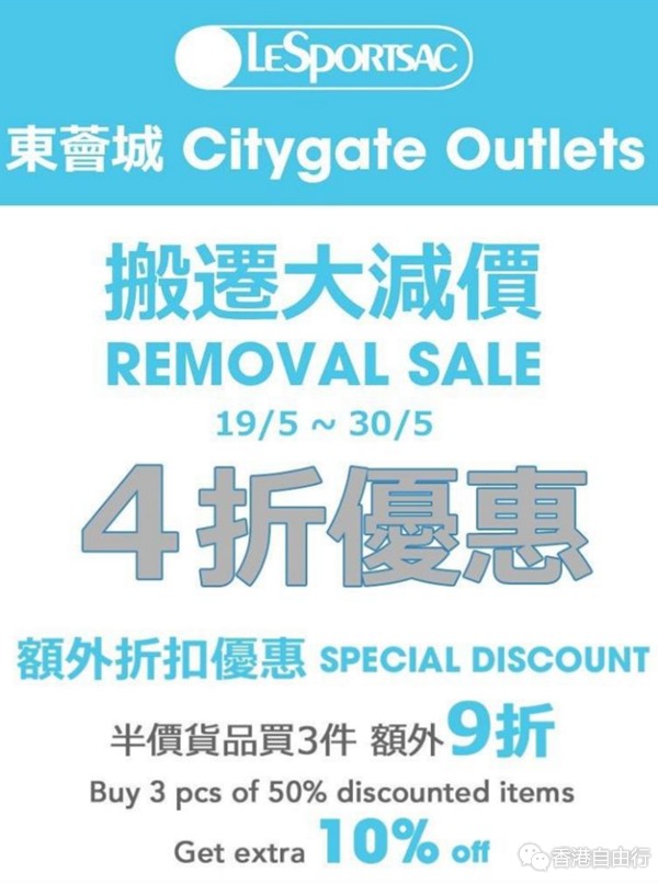 香港打折:东荟城LeSportsac低至4折搬迁优惠(至17年5月30日)