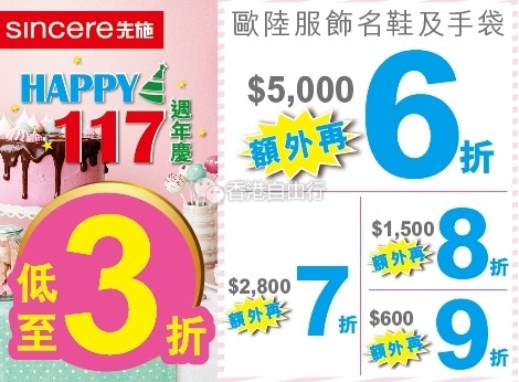 香港优惠:先施117周年庆 名鞋、手袋等低至3折!REEBOK、NB等均一价(至7月25日)