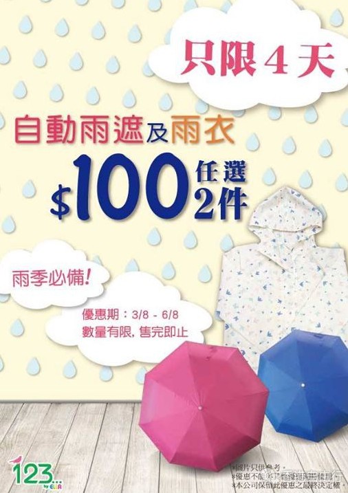 由即日起,自动雨伞及雨衣任选$100/2件哦!有自动雨伞再加上雨衣一定不怕湿身啦!趁现在有优惠快来买啦!全港27间分店有售,要留意货品数量有限,售完即止。只限4日! 快点来疯狂抢购啦!