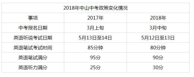 3月7日,中山市教育和体育局发布《中山市2018年高中阶段学校考试招生工作意见》(以下简称《招生意见》)。同2017年相比,今年中山中考政策主体保持稳定,主要对体艺类招生、英语科目考试、加分政策三个方面作了相应调整。中考英语科目笔试部分满分由95分调整为90分,笔试考试时间由85分钟调整为80分钟。英语科听力部分满分将由25分调整为30分,考试题型、题量及考试时间不变。同时,中山还增加了公安烈士和公安英模的子女在报考普通高中录取时可加5分投档的录取政策。