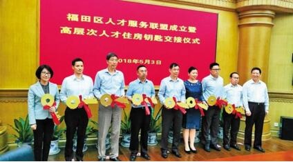 5月3日,福田区举行人才服务联盟成立暨高层次人才住房钥匙交接仪式。福田区领导向人才服务联盟单位代表授牌,向高层次人才代表颁发了拧包入住的住房钥匙。该人才服务联盟是我市首个区级层面政企合作的引才揽才服务平台。