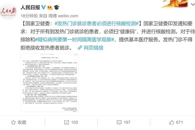 对于所有到发热门诊就诊的患者,必须扫“健康码”,并进行核酸检测。对于待排除和疑似病例要第一时间隔离医学观察,提供基本医疗服务。发热门诊不得拒绝接收发热患者就诊。